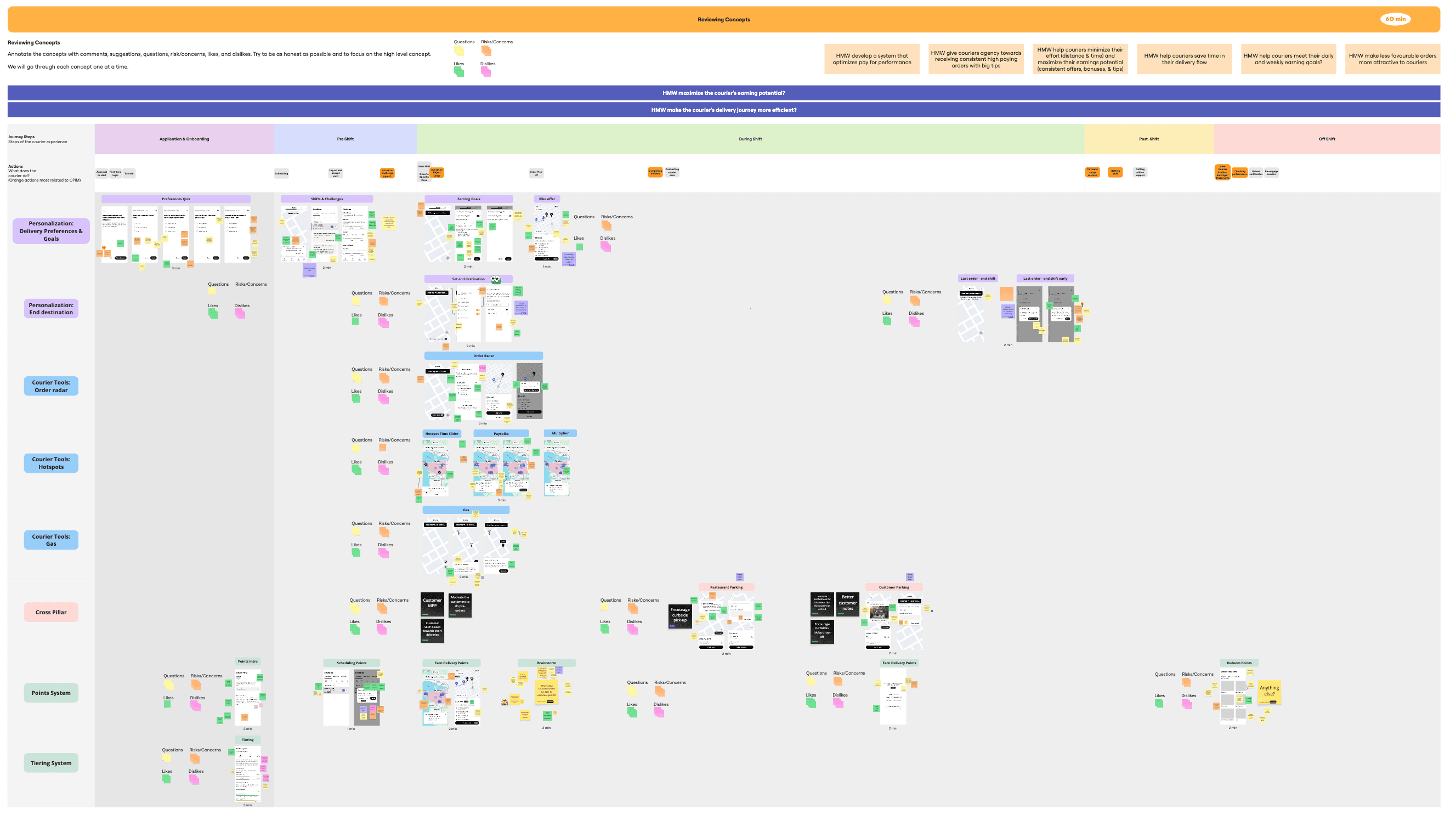 In our ideation workshop, we recapped our courier pay research and past workshop outputs. Then, we ideated on our HMW’s with sticky notes: