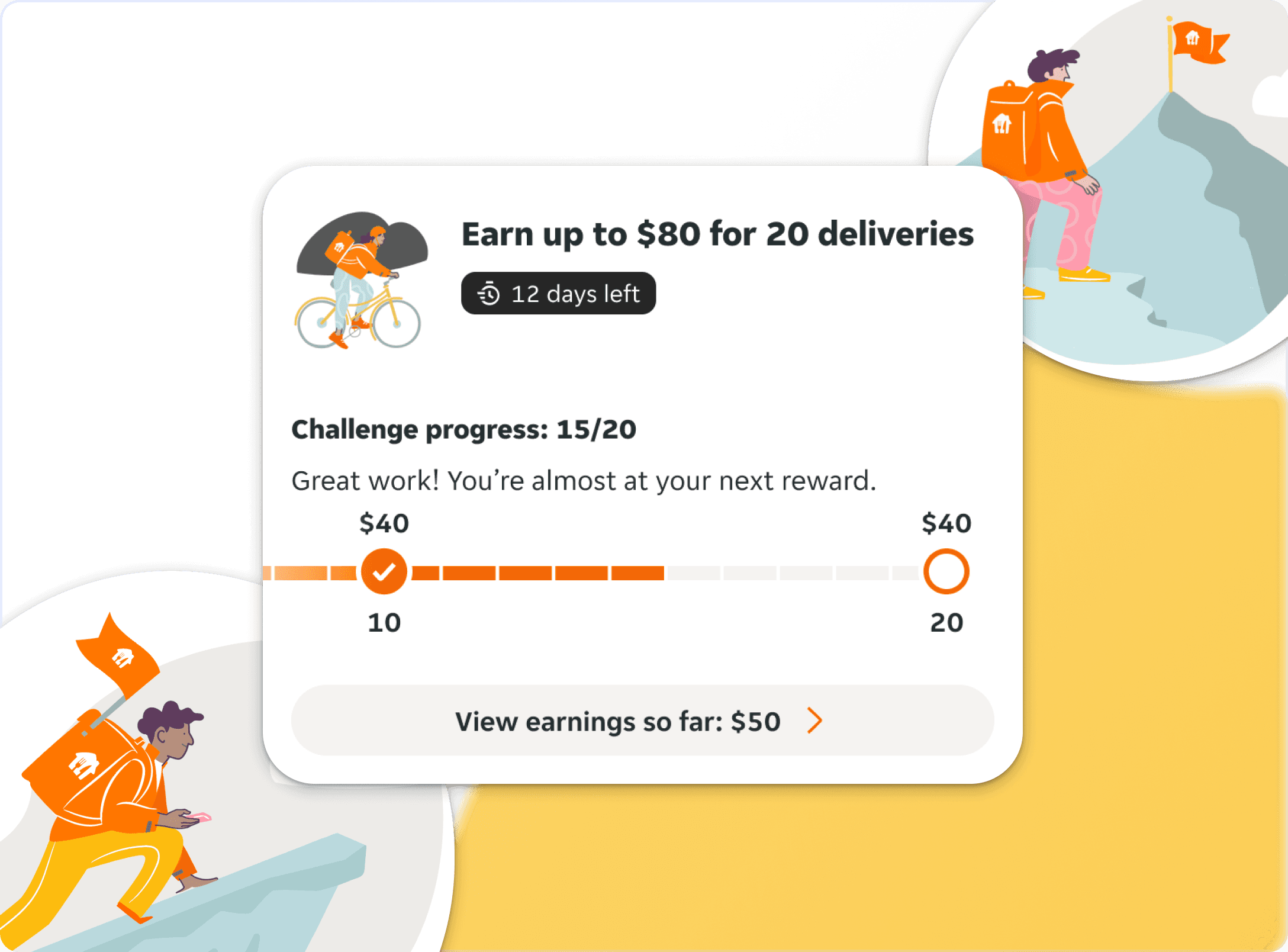 Couriers, or delivery drivers, are given “Challenges” to complete for a reward. For example, a Challenge could be “Complete 6 deliveries for a $25 reward”.