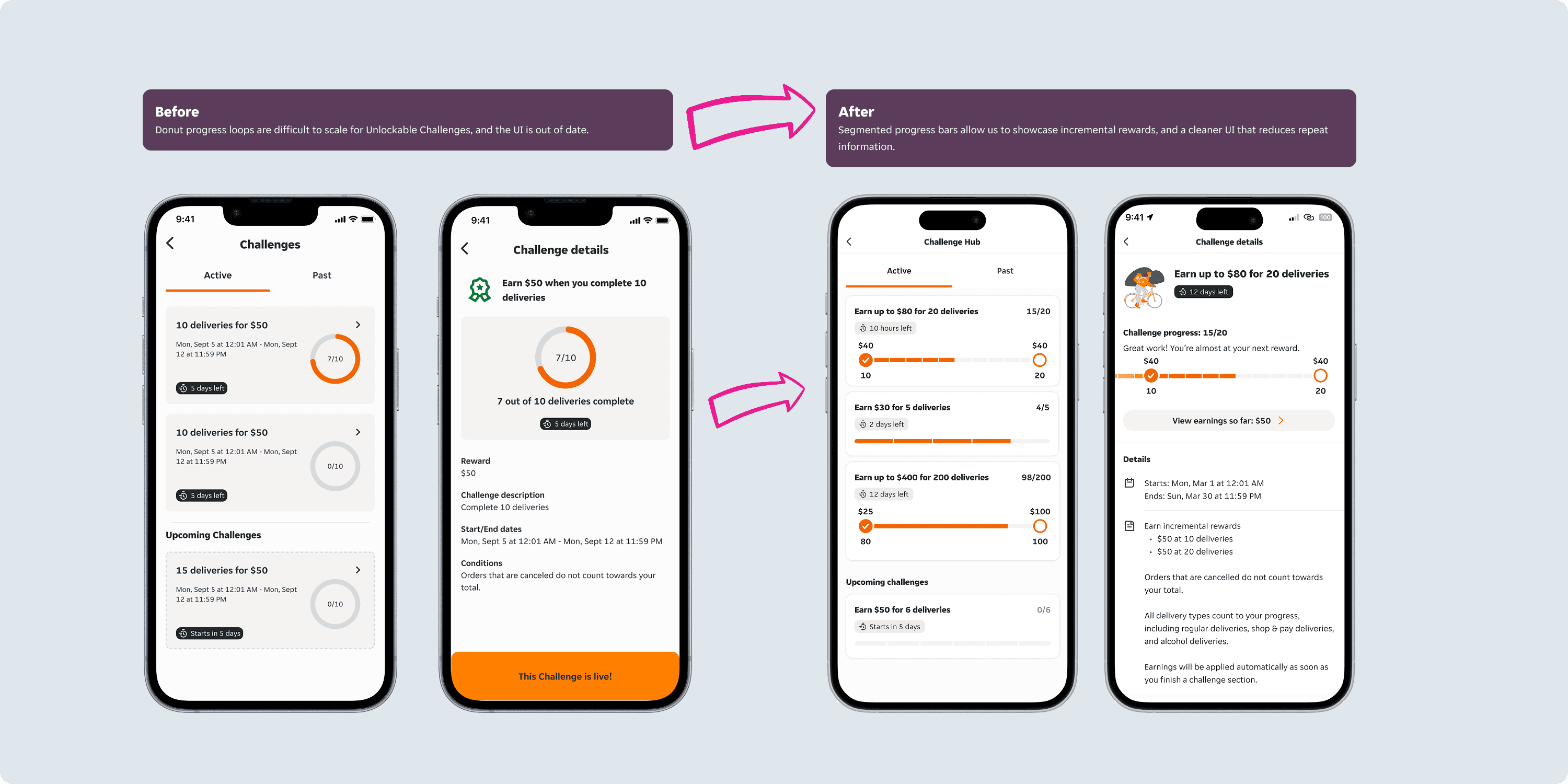 Existing research has found the structure of Unlockable Challenges is highly motivating. It provides couriers with an early win and a sense of progression as they accomplish each checkpoint. This creates feelings of achievability, which drives satisfaction and boosts acceptance rate, shifts worked, and PtoD (delivery speed).